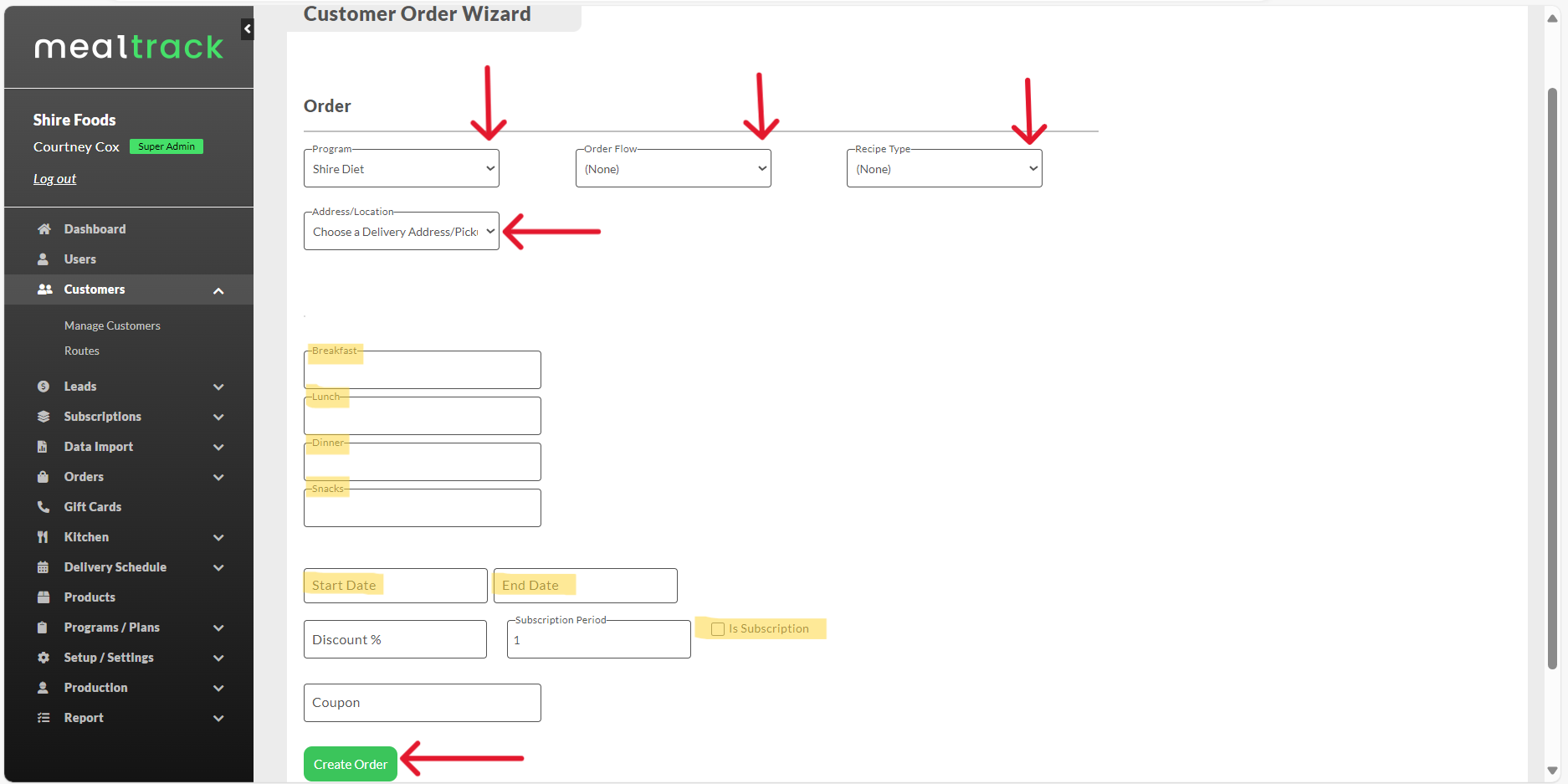 3. Select the appropriate Program, Order Flow, Recipe Type (not required), Address/Location, and input the appropriate information regarding meals. Be sure to check the "Is Subscription" box to create a recurring subscription order. Enter the Start Date and End Date for the order and click "Create Order".