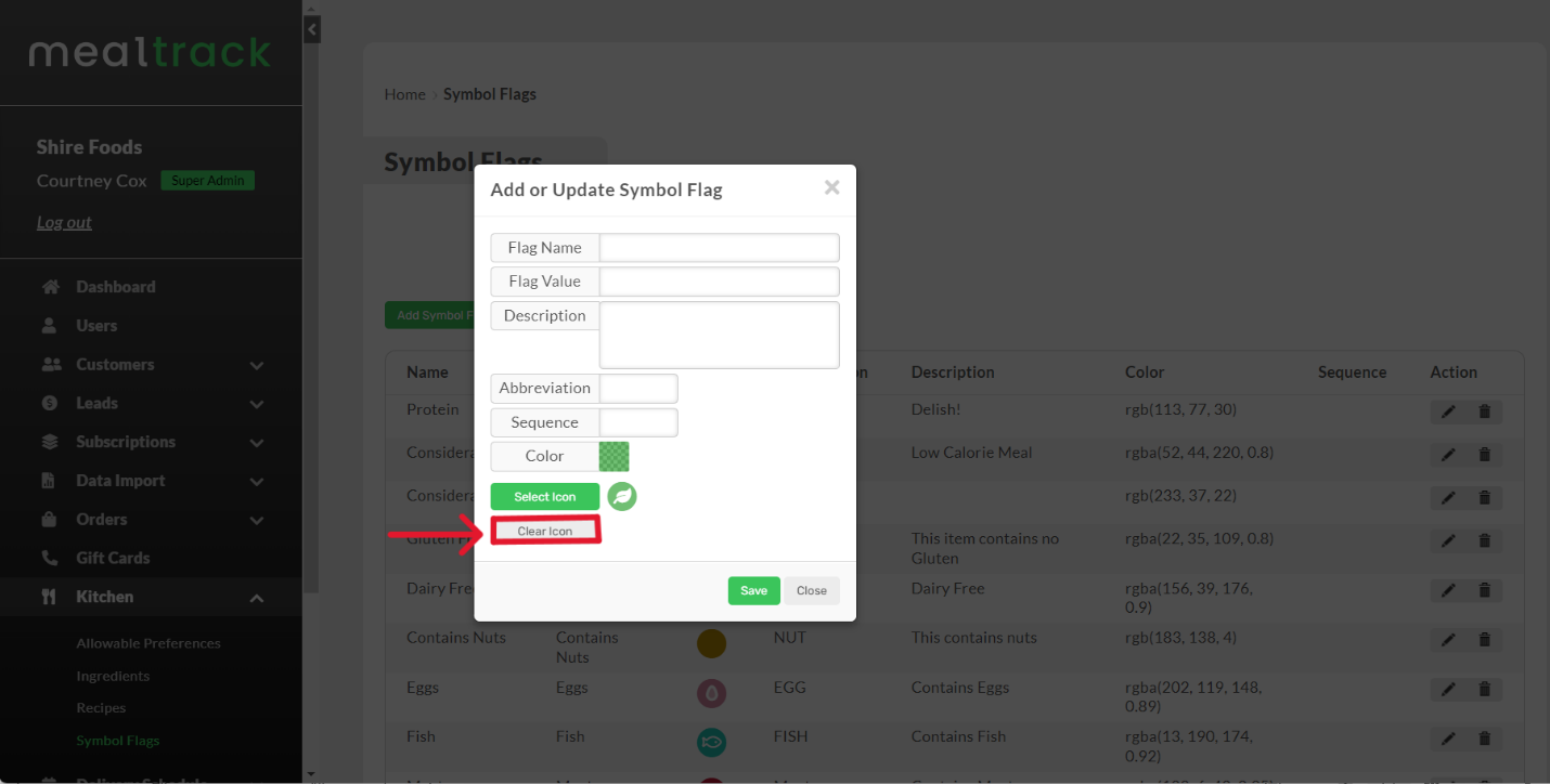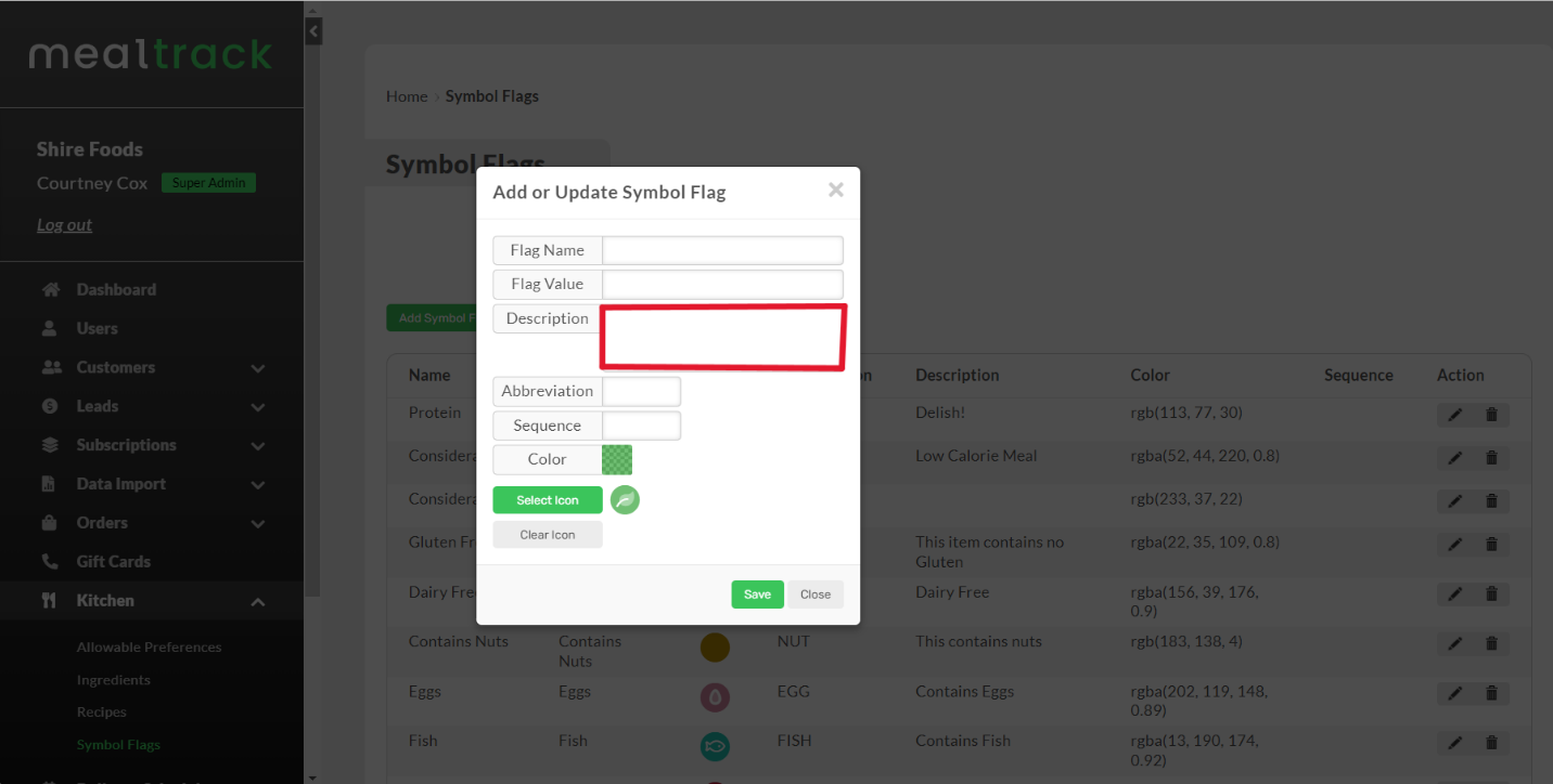 b. For example, if you want to create a symbol flag to note that a recipe contains bacon, the Description could be this meal contains bacon.