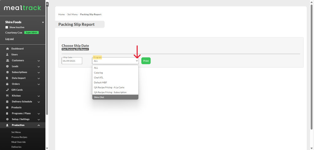 4. Once you have selected your Ship Date and Program (if necessary), click the green button labeled "Print".