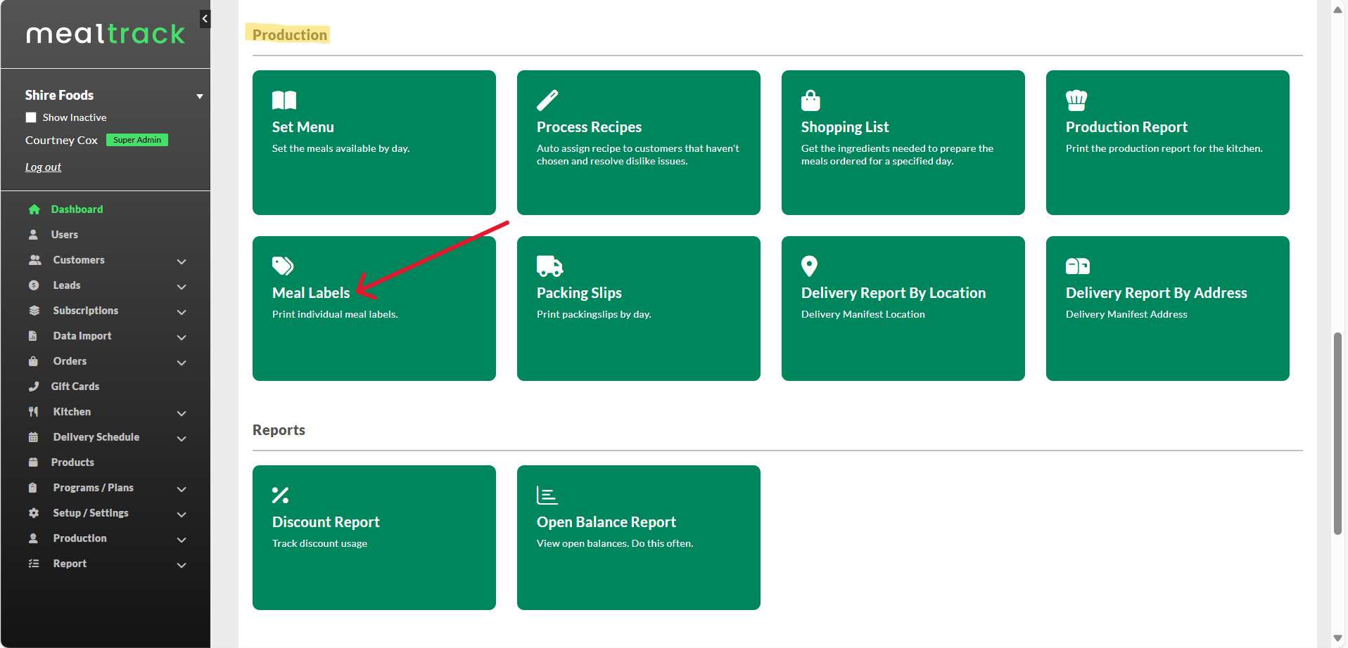 a. Scroll down on your dashboard to the Production section and click "Meal Labels" as seen in the first picture below.