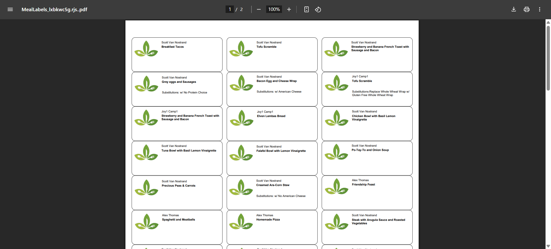 6. The PDF file will display your meal labels in the format you chose (e.g., a depiction of 10x3 meal labels is shown in the picture below).