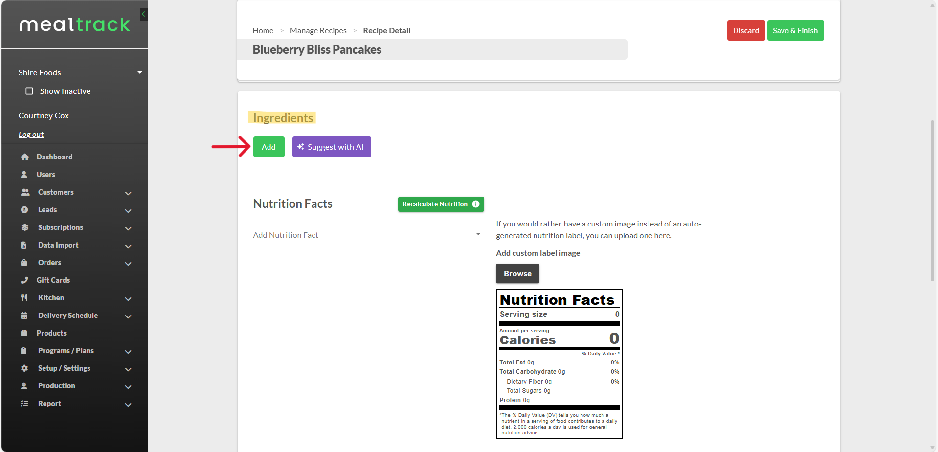 a. If you are done adding ingredients, click the green button labeled "Save & Finish" in the top right-hand corner shown in the picture below.